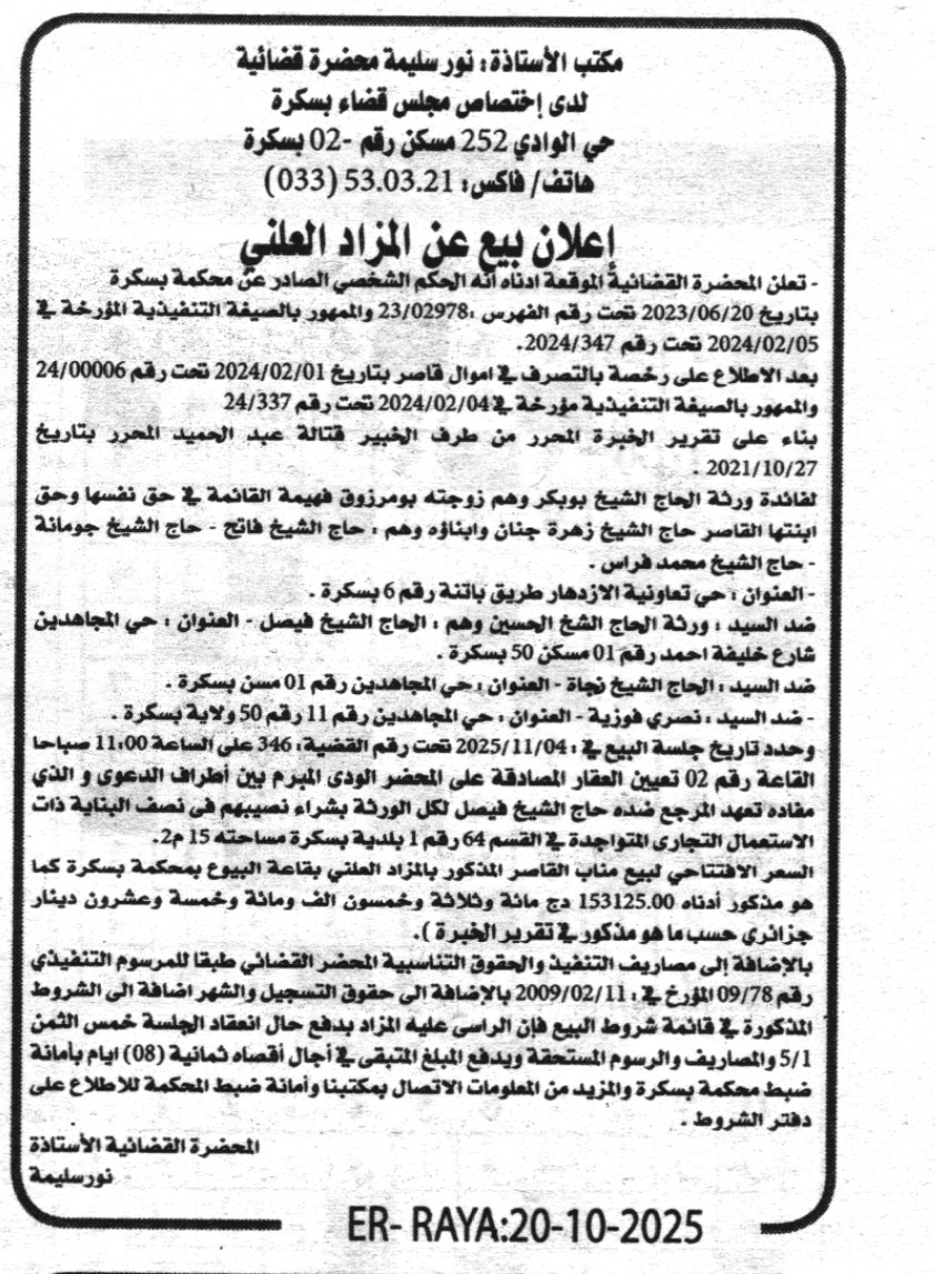 Il sera procédé à la vente au plus offrant et dernier enchérisseur le : 27/10/2025';