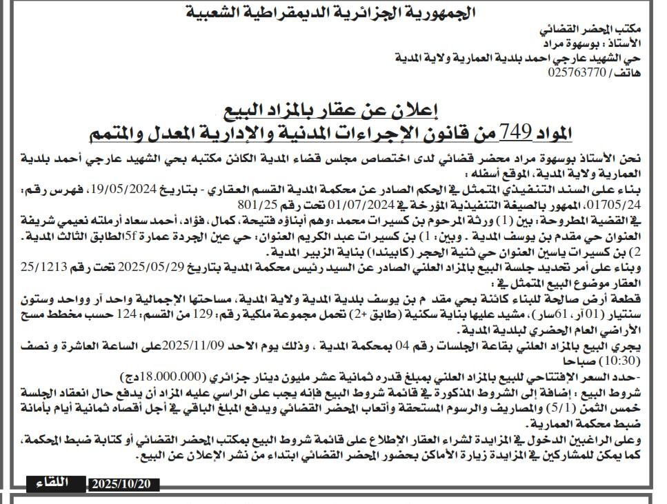 Il sera procédé à la vente au plus offrant et dernier enchérisseur le :
