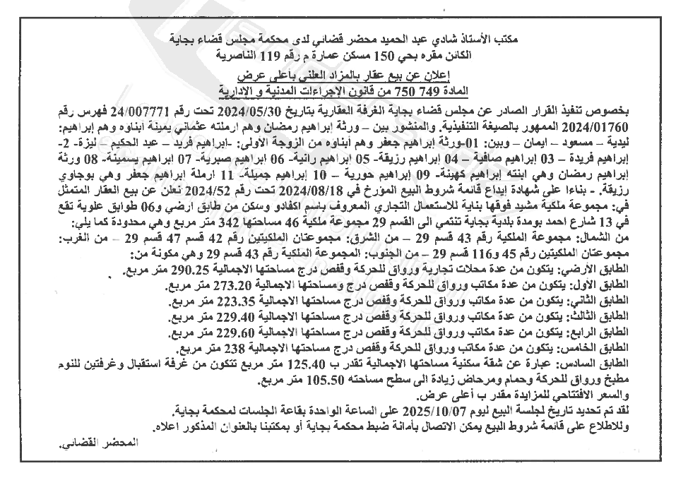 Il sera procédé à la vente au plus offrant et dernier enchérisseur le : 07/10/2025';