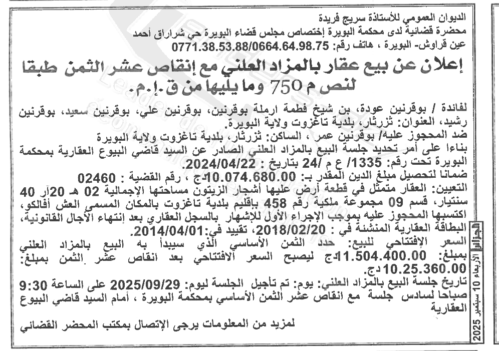 Il sera procédé à la vente au plus offrant et dernier enchérisseur le : 29/09/2025';