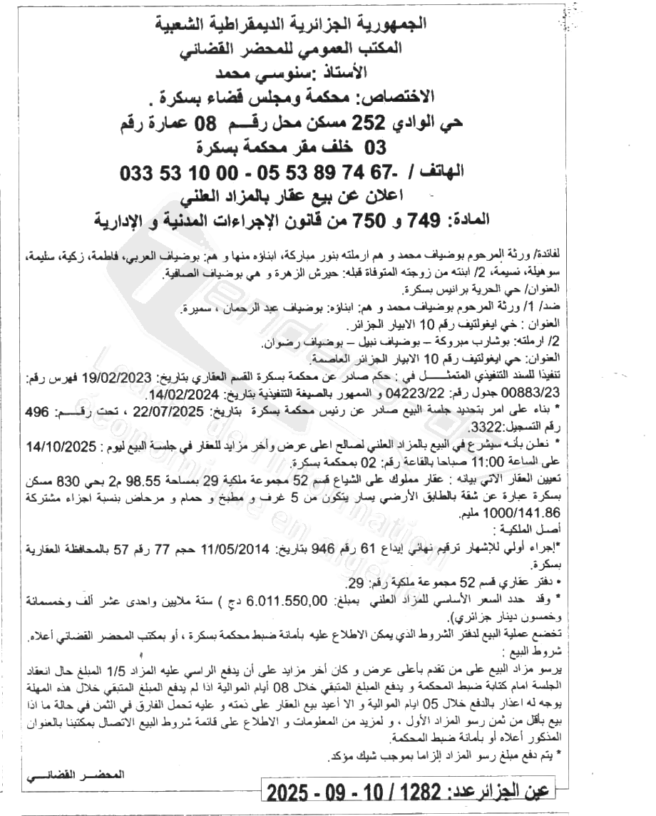 Il sera procédé à la vente au plus offrant et dernier enchérisseur le : 17/09/2025';