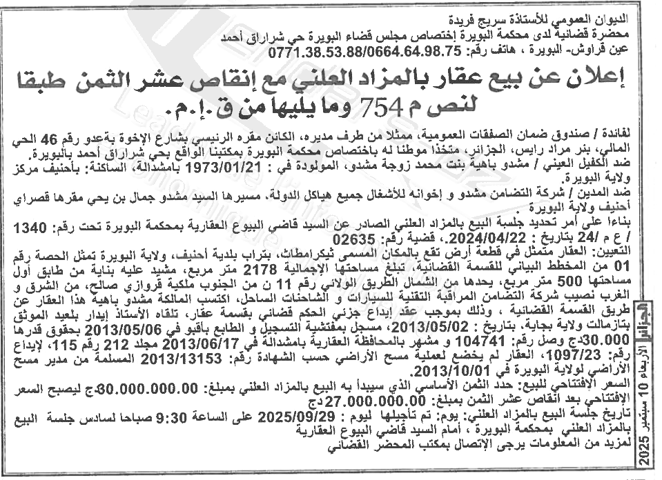 Il sera procédé à la vente au plus offrant et dernier enchérisseur le : 29/09/2025';