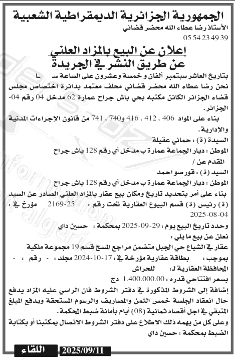 Il sera procédé à la vente au plus offrant et dernier enchérisseur le :