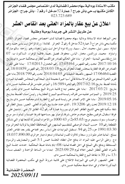 Il sera procédé à la vente au plus offrant et dernier enchérisseur le : 18/09/2025';