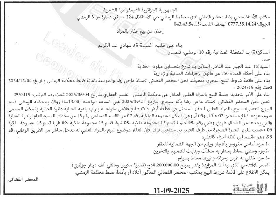 Il sera procédé à la vente au plus offrant et dernier enchérisseur le :