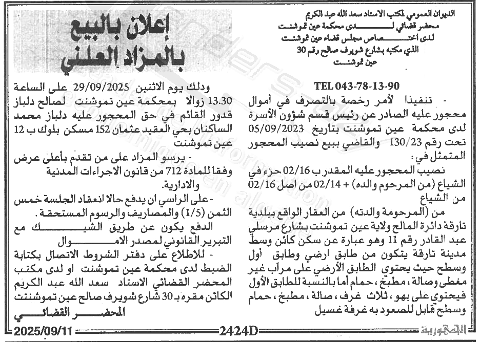 Il sera procédé à la vente au plus offrant et dernier enchérisseur le : 29/09/2025