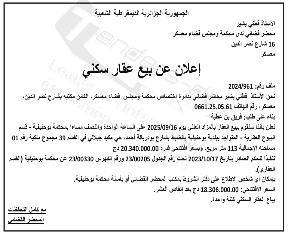 Il sera procédé à la vente au plus offrant et dernier enchérisseur le :