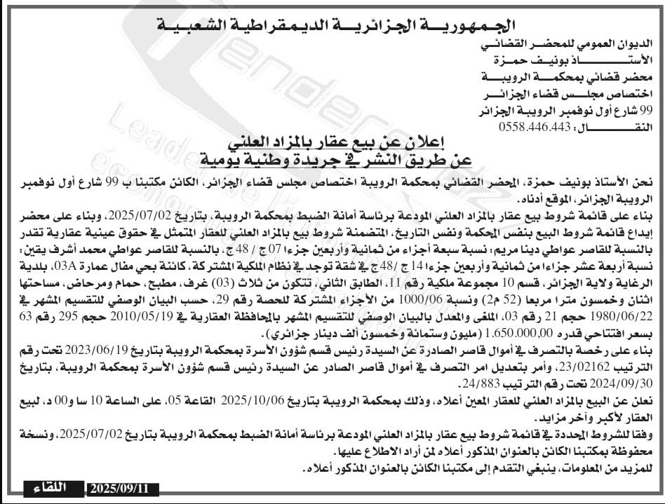 Il sera procédé à la vente au plus offrant et dernier enchérisseur le :