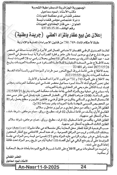 Il sera procédé à la vente au plus offrant et dernier enchérisseur le : 18/09/2025