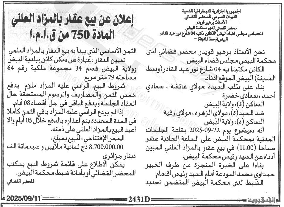 Il sera procédé à la vente au plus offrant et dernier enchérisseur le :