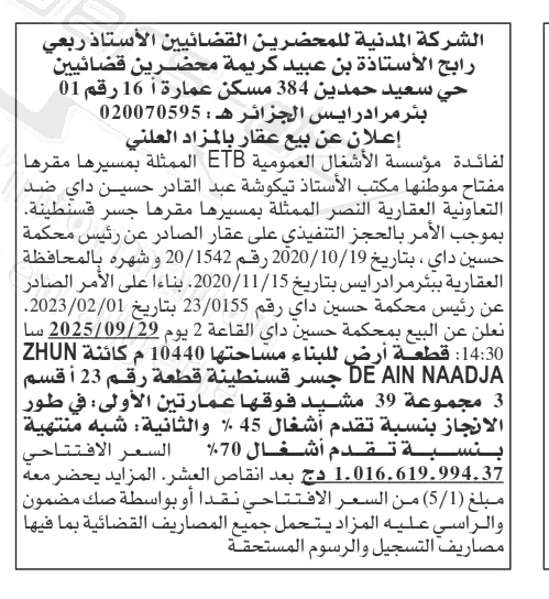 Il sera procédé à la vente au plus offrant et dernier enchérisseur le :