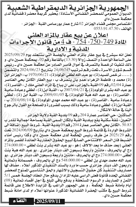 Il sera procédé à la vente au plus offrant et dernier enchérisseur le :