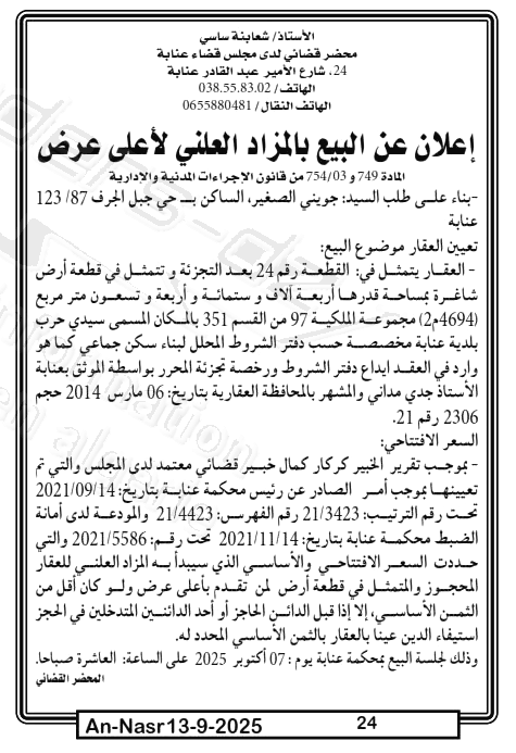 Il sera procédé à la vente au plus offrant et dernier enchérisseur le : 07/10/2025';