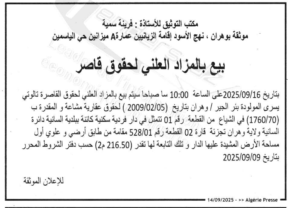 Il sera procédé à la vente au plus offrant et dernier enchérisseur le :