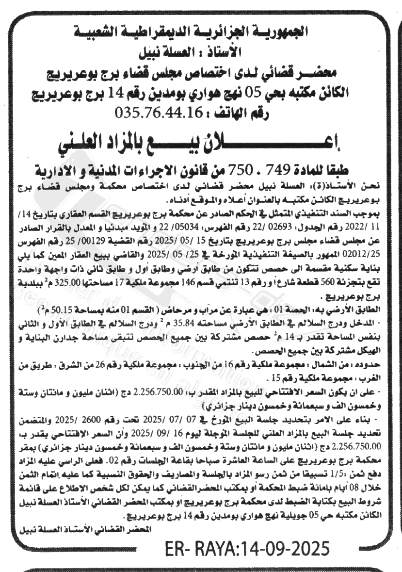 Il sera procédé à la vente au plus offrant et dernier enchérisseur le : 16/09/2025';