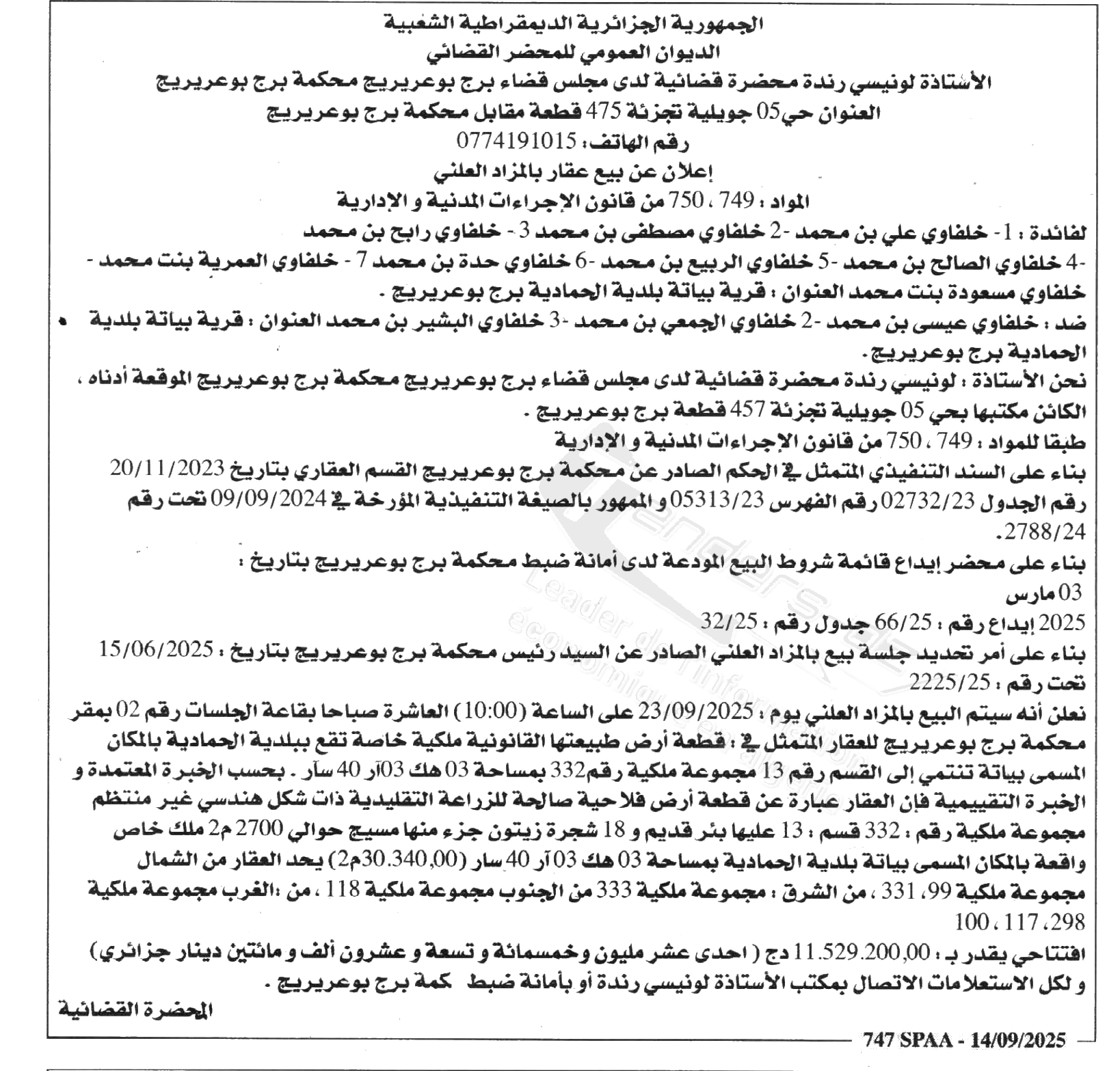 Il sera procédé à la vente au plus offrant et dernier enchérisseur le :