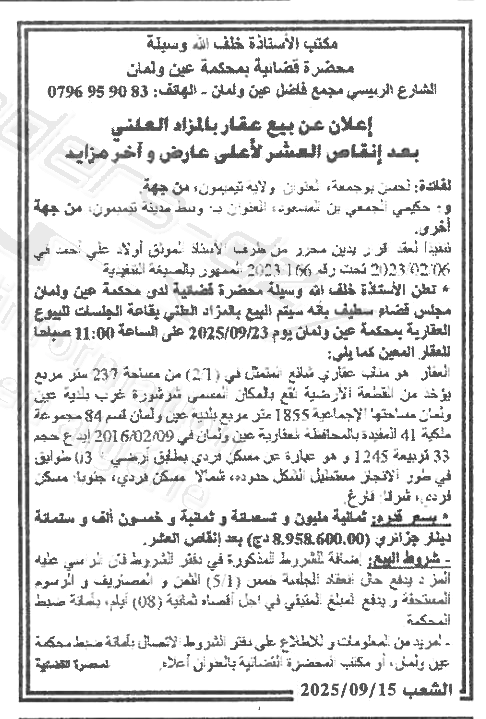 Il sera procédé à la vente au plus offrant et dernier enchérisseur le :