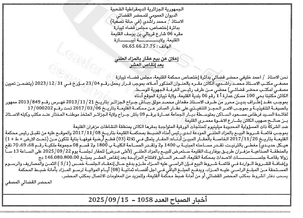 Il sera procédé à la vente au plus offrant et dernier enchérisseur le :