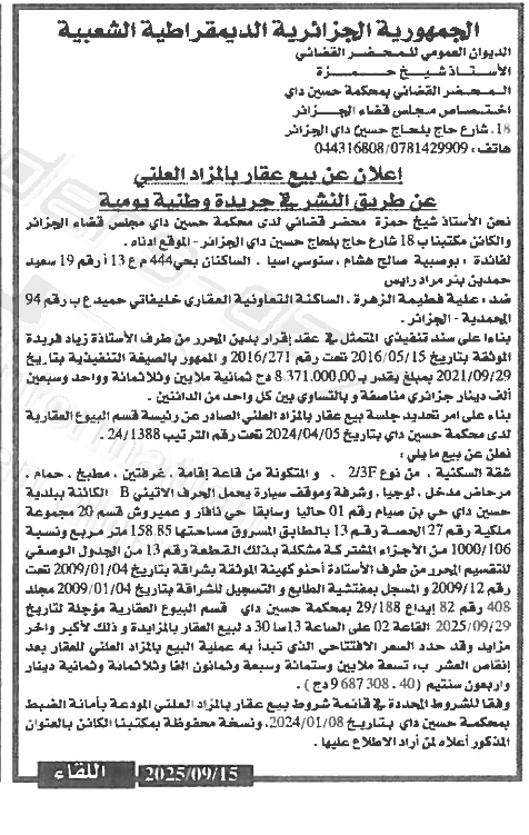 Il sera procédé à la vente au plus offrant et dernier enchérisseur le :