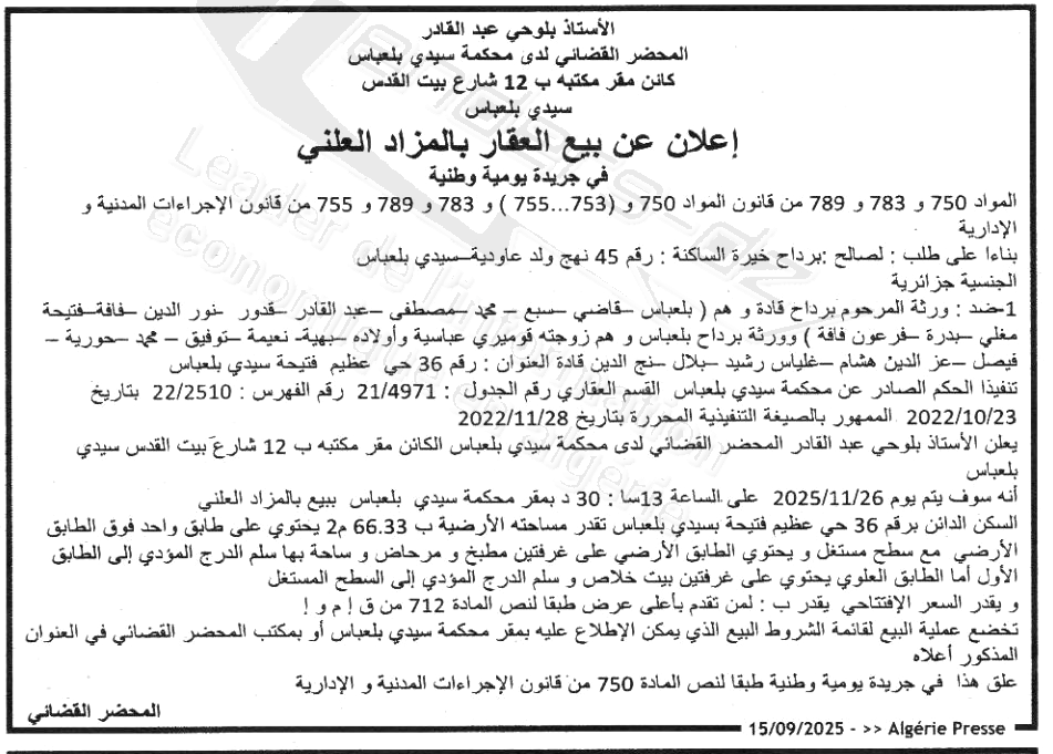 Il sera procédé à la vente au plus offrant et dernier enchérisseur le : 22/09/2025';
