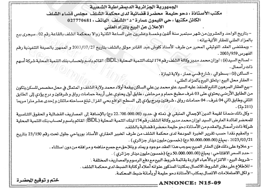 Il sera procédé à la vente au plus offrant et dernier enchérisseur le :