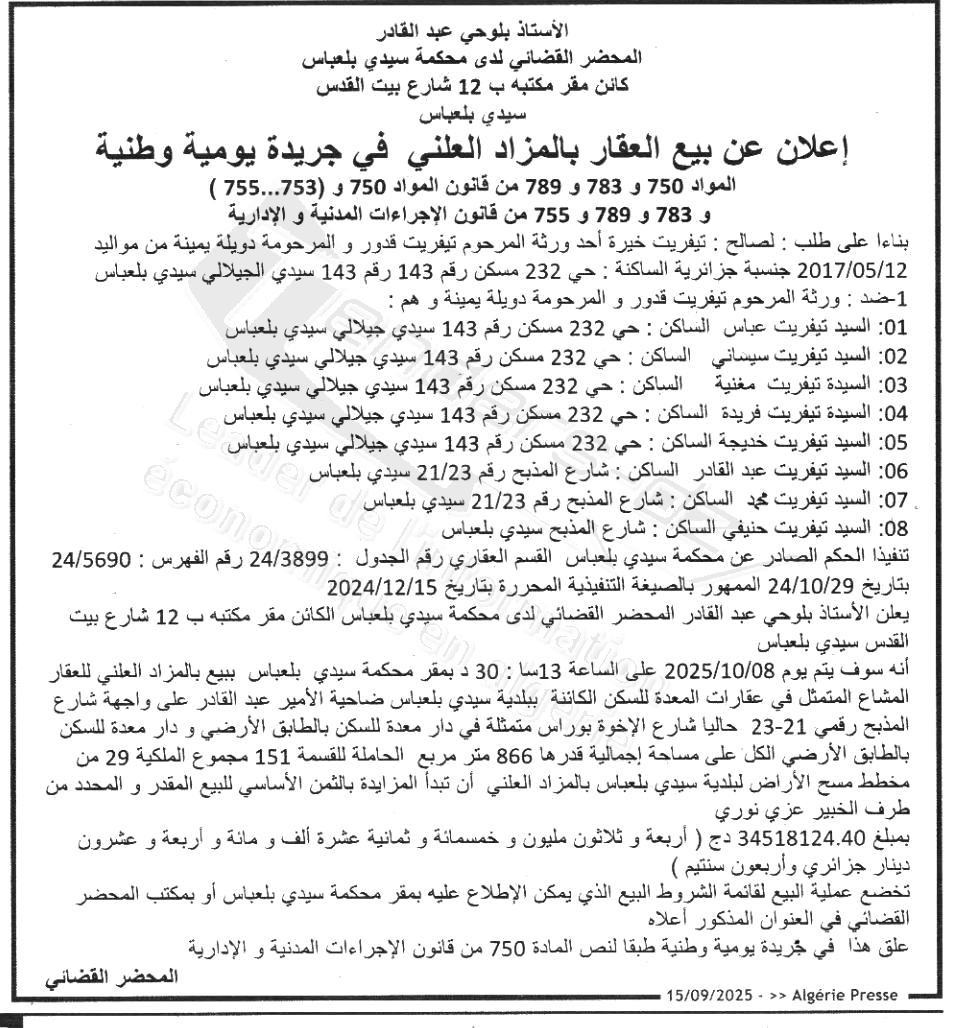 Il sera procédé à la vente au plus offrant et dernier enchérisseur le :
