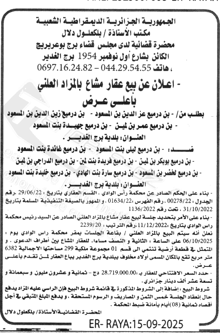 Il sera procédé à la vente au plus offrant et dernier enchérisseur le : 22/09/2025';