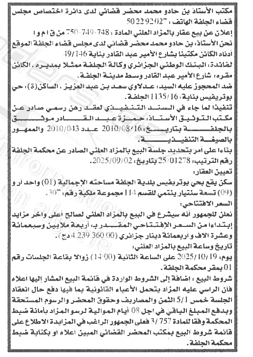 Il sera procédé à la vente au plus offrant et dernier enchérisseur le : 22/09/2025