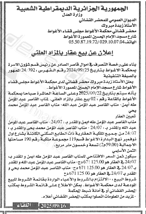 Il sera procédé à la vente au plus offrant et dernier enchérisseur le : 22/09/2025';