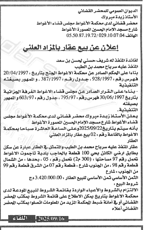 Il sera procédé à la vente au plus offrant et dernier enchérisseur le : 22/09/2025