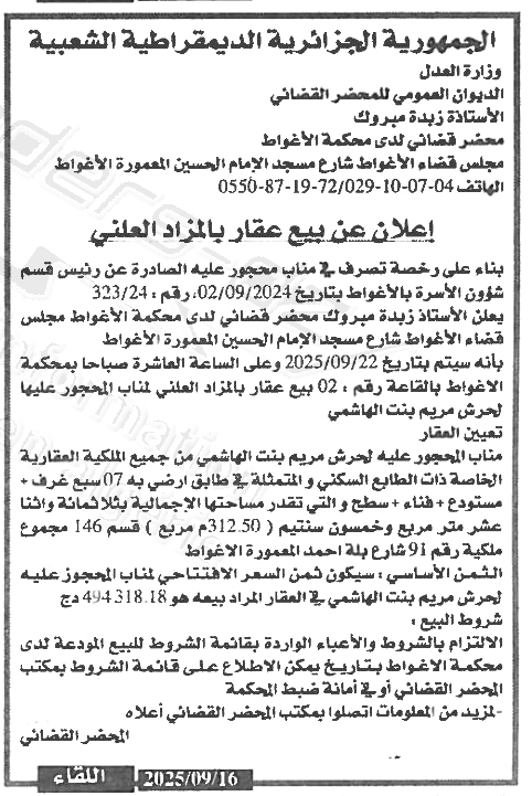 Il sera procédé à la vente au plus offrant et dernier enchérisseur le : 22/09/2025';