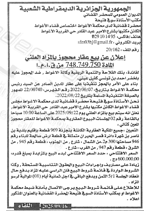 Il sera procédé à la vente au plus offrant et dernier enchérisseur le : 22/09/2025