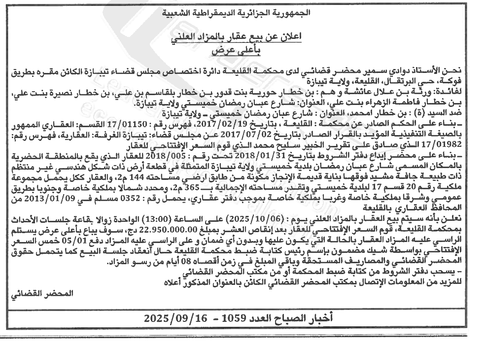 Il sera procédé à la vente au plus offrant et dernier enchérisseur le :