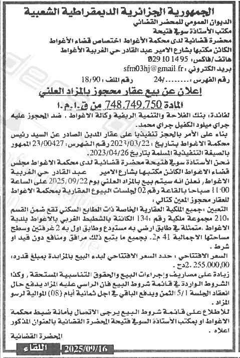 Il sera procédé à la vente au plus offrant et dernier enchérisseur le :