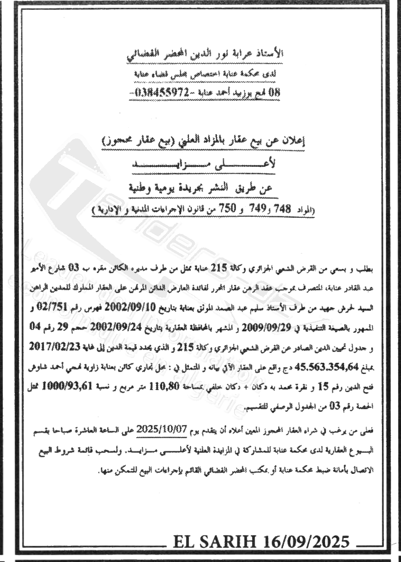 Il sera procédé à la vente au plus offrant et dernier enchérisseur le :
