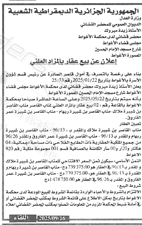 Il sera procédé à la vente au plus offrant et dernier enchérisseur le : 23/09/2025';
