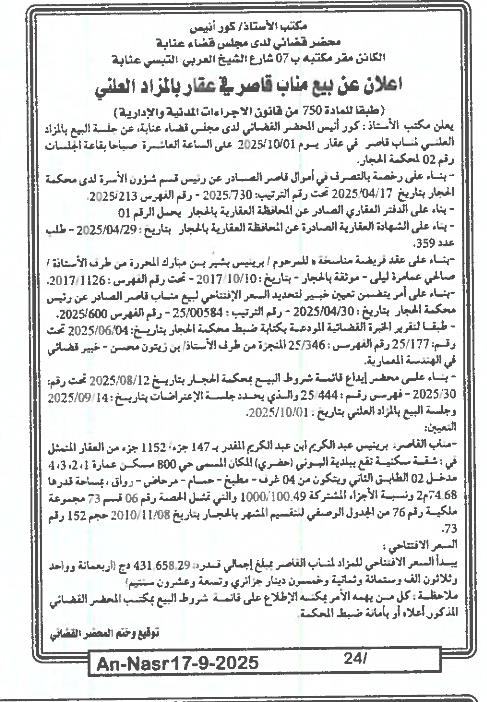 Il sera procédé à la vente au plus offrant et dernier enchérisseur le : 24/09/2025';