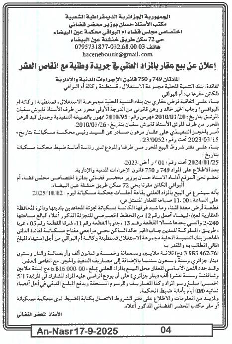 Il sera procédé à la vente au plus offrant et dernier enchérisseur le :