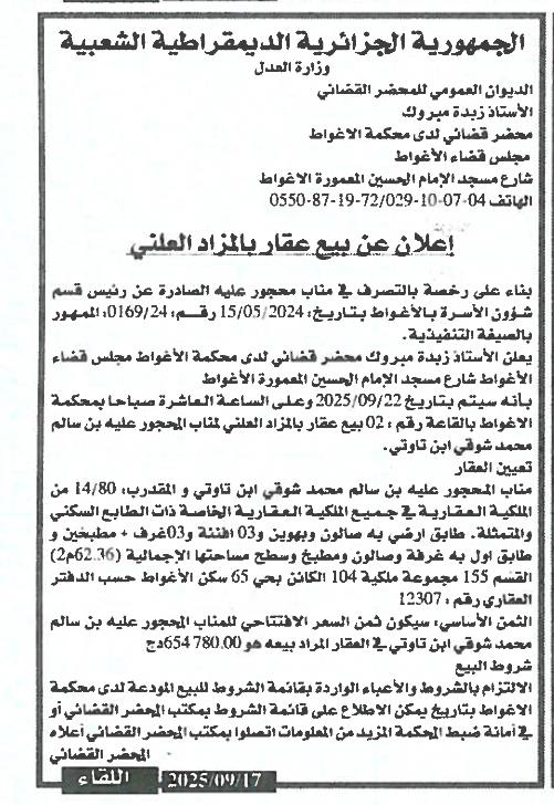 Il sera procédé à la vente au plus offrant et dernier enchérisseur le : 22/09/2025