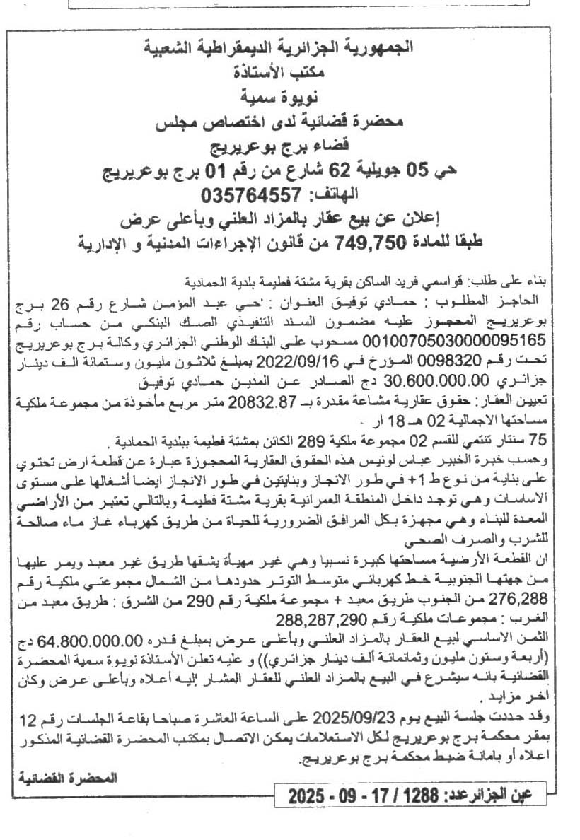 Il sera procédé à la vente au plus offrant et dernier enchérisseur le :