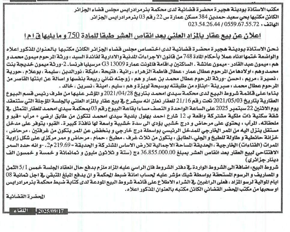 Il sera procédé à la vente au plus offrant et dernier enchérisseur le : 24/09/2025';