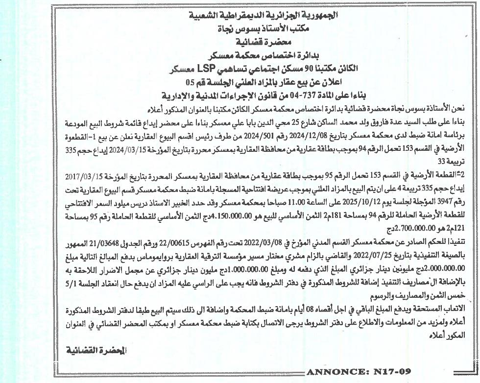 Il sera procédé à la vente au plus offrant et dernier enchérisseur le :