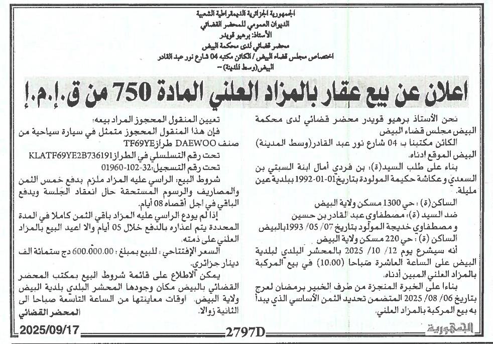 Il sera procédé à la vente au plus offrant et dernier enchérisseur le :