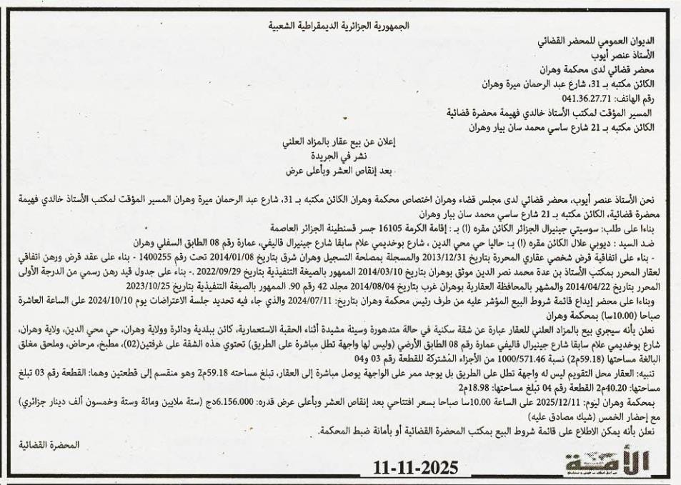 Il sera procédé à la vente au plus offrant et dernier enchérisseur le : 11/12/2025