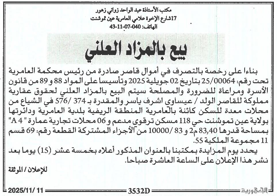 Il sera procédé à la vente au plus offrant et dernier enchérisseur le : 25/11/2025';