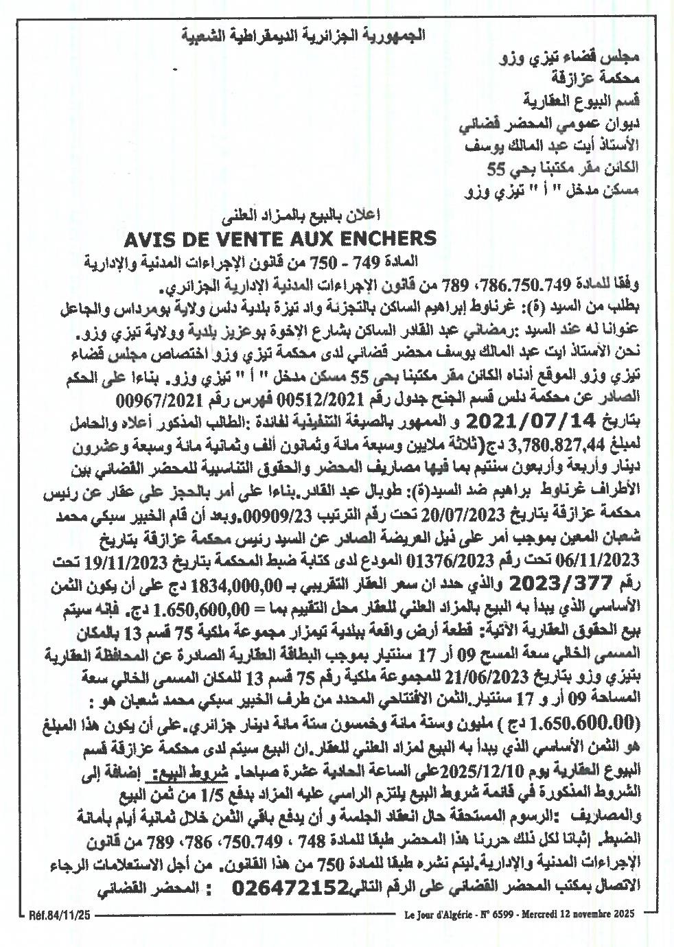 Il sera procédé à la vente au plus offrant et dernier enchérisseur le :