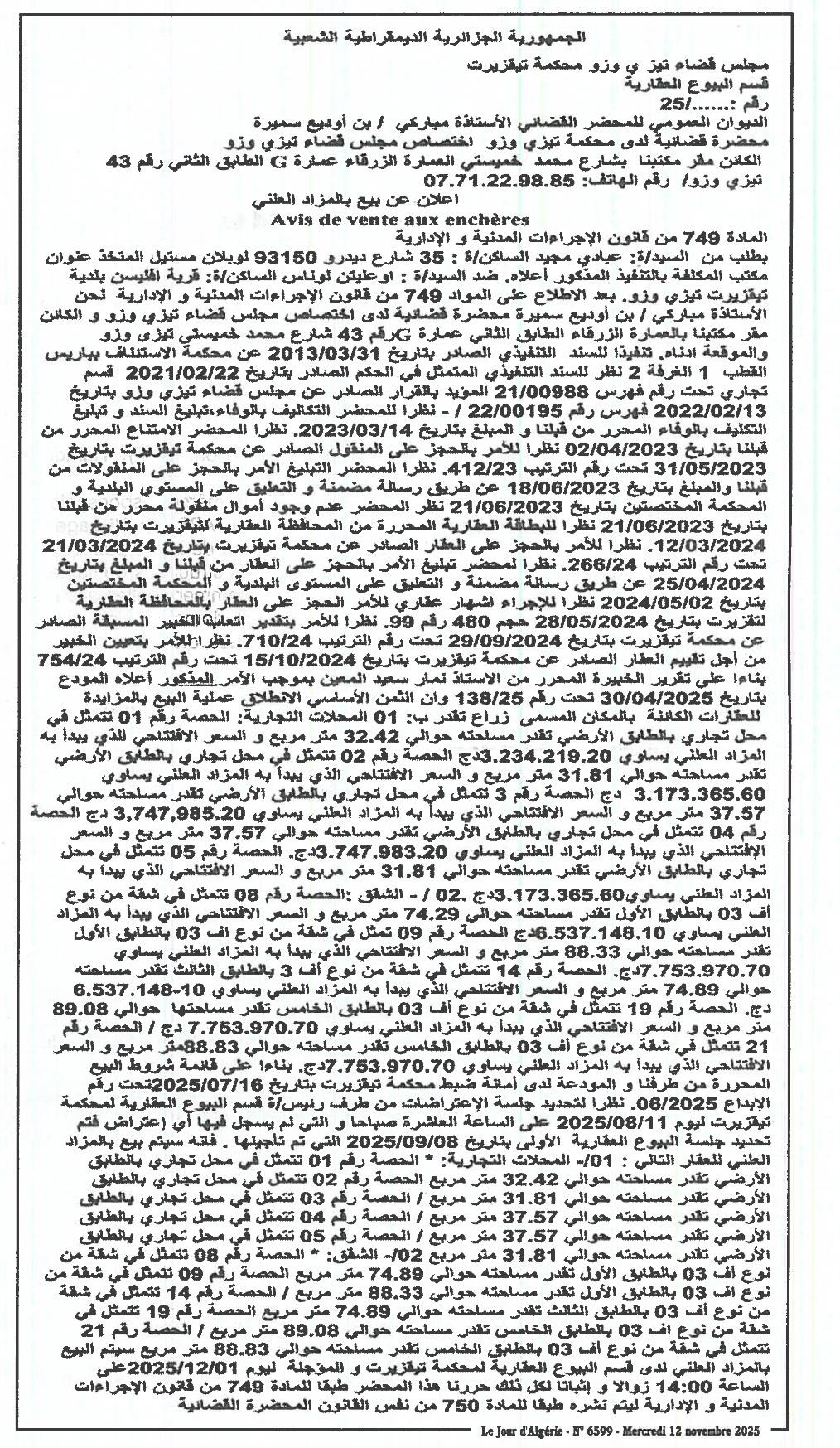 Il sera procédé à la vente au plus offrant et dernier enchérisseur le :