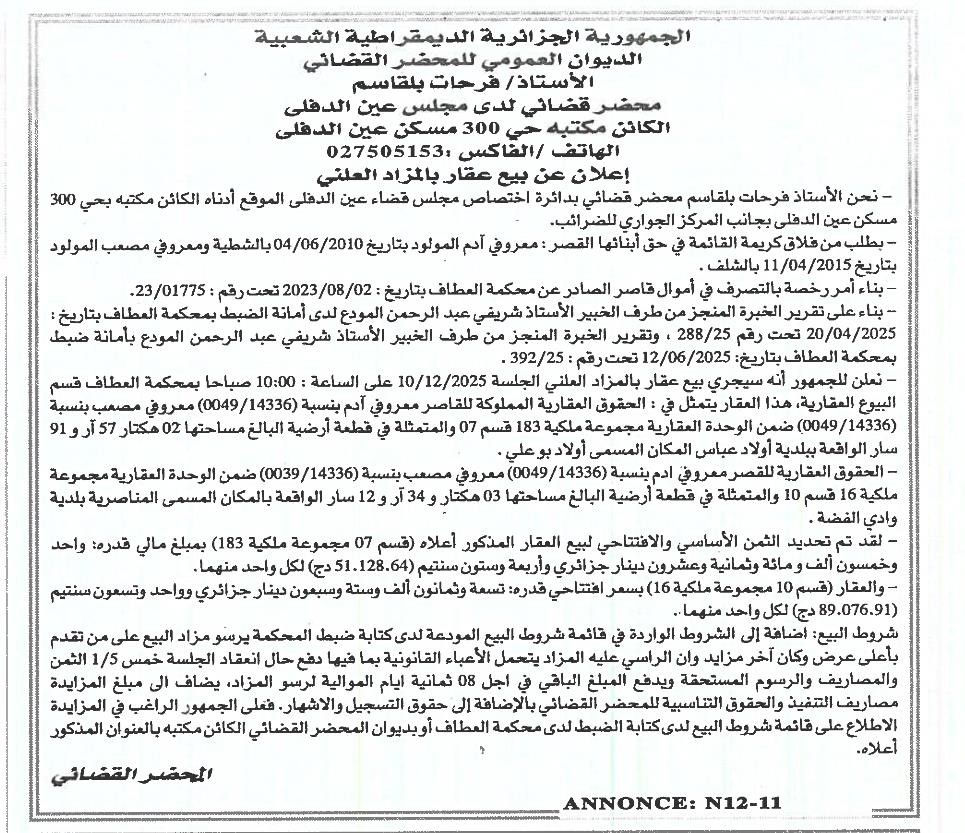 Il sera procédé à la vente au plus offrant et dernier enchérisseur le :