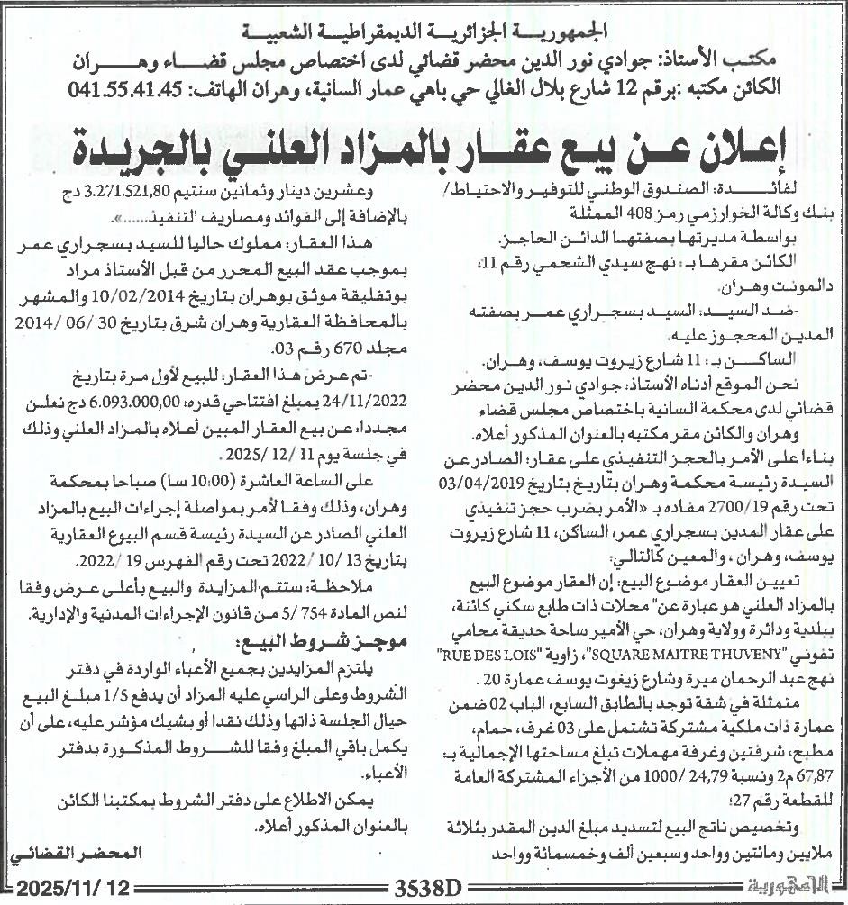 Il sera procédé à la vente au plus offrant et dernier enchérisseur le :