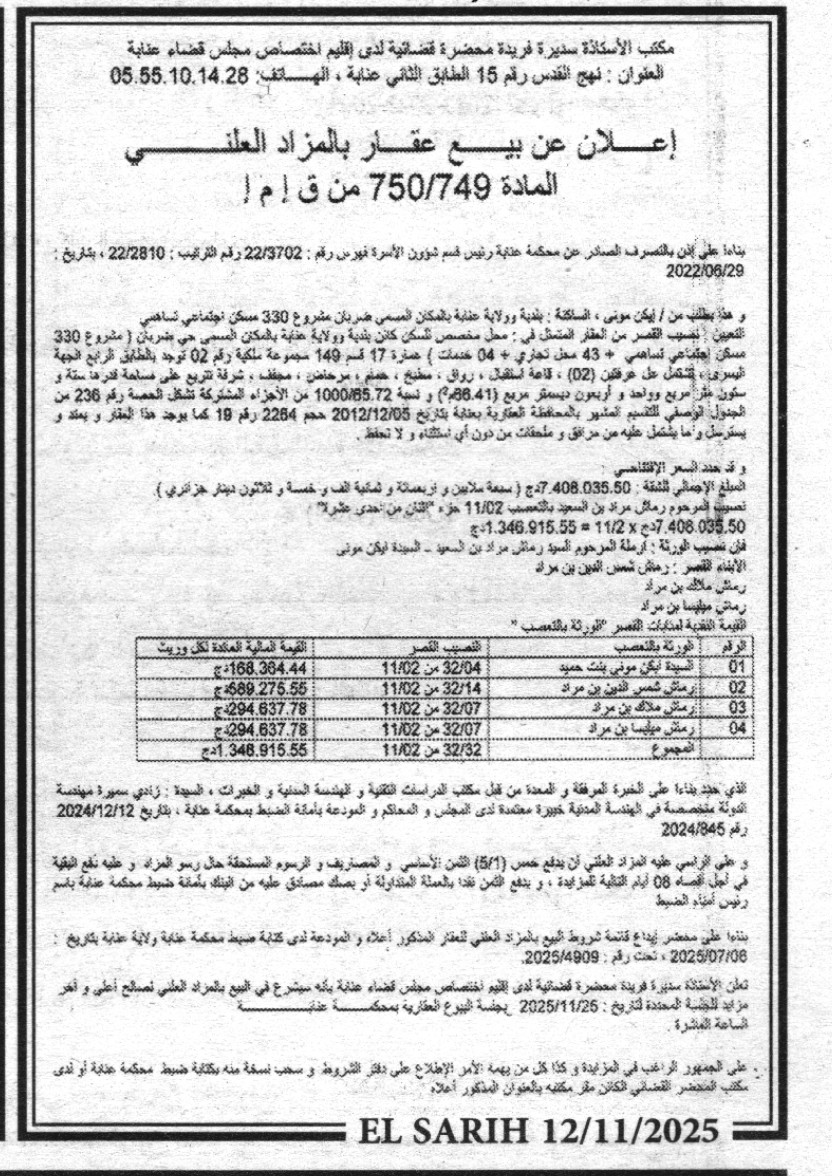 Il sera procédé à la vente au plus offrant et dernier enchérisseur le : 25/11/2025';